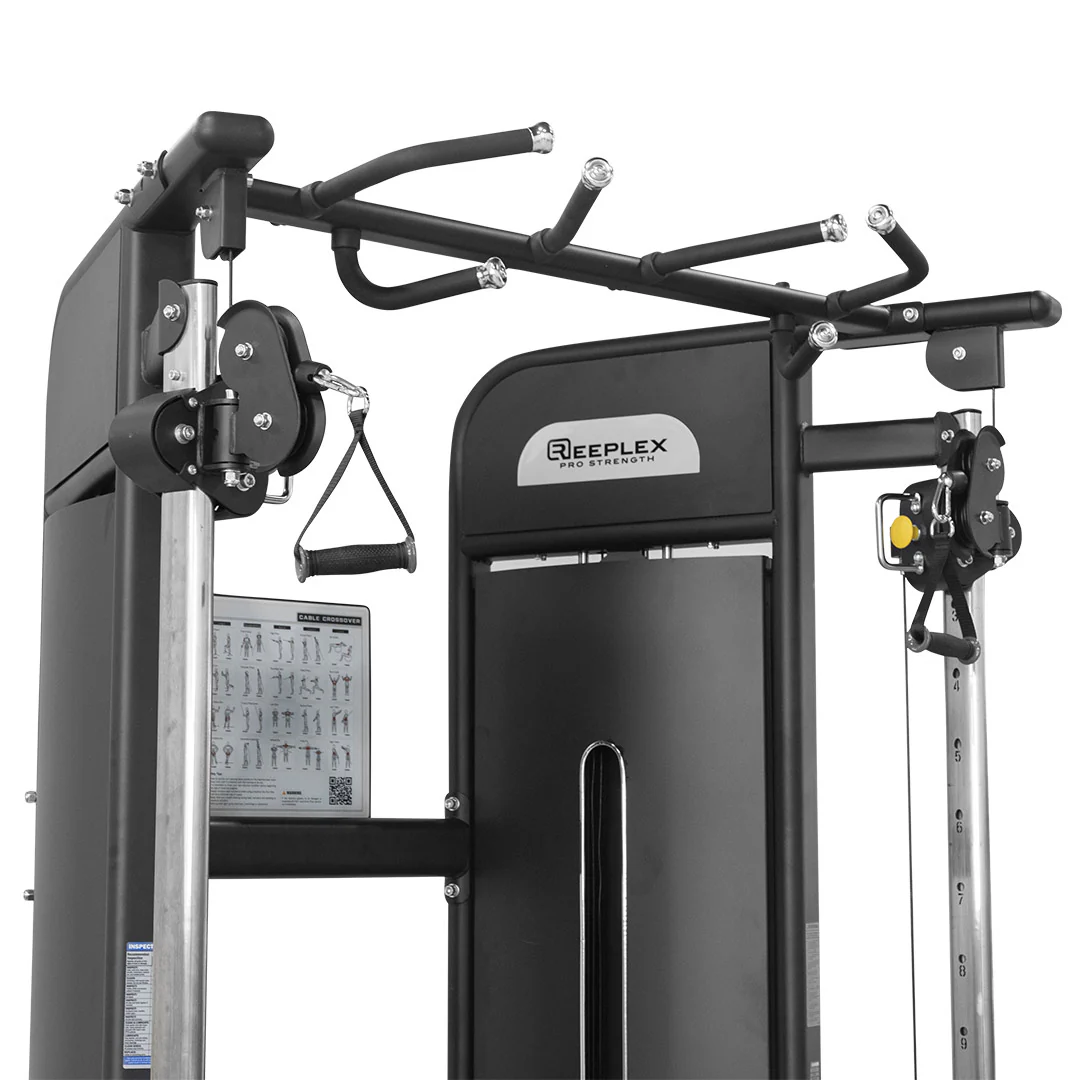 Reeplex Commercial Pin Loaded Functional Trainer offers a steel machined 2 x 150kg weight stack utilizing a sealed bearing pulley system providing responsive cable resistance when selecting from 7.5kg to 150kg.