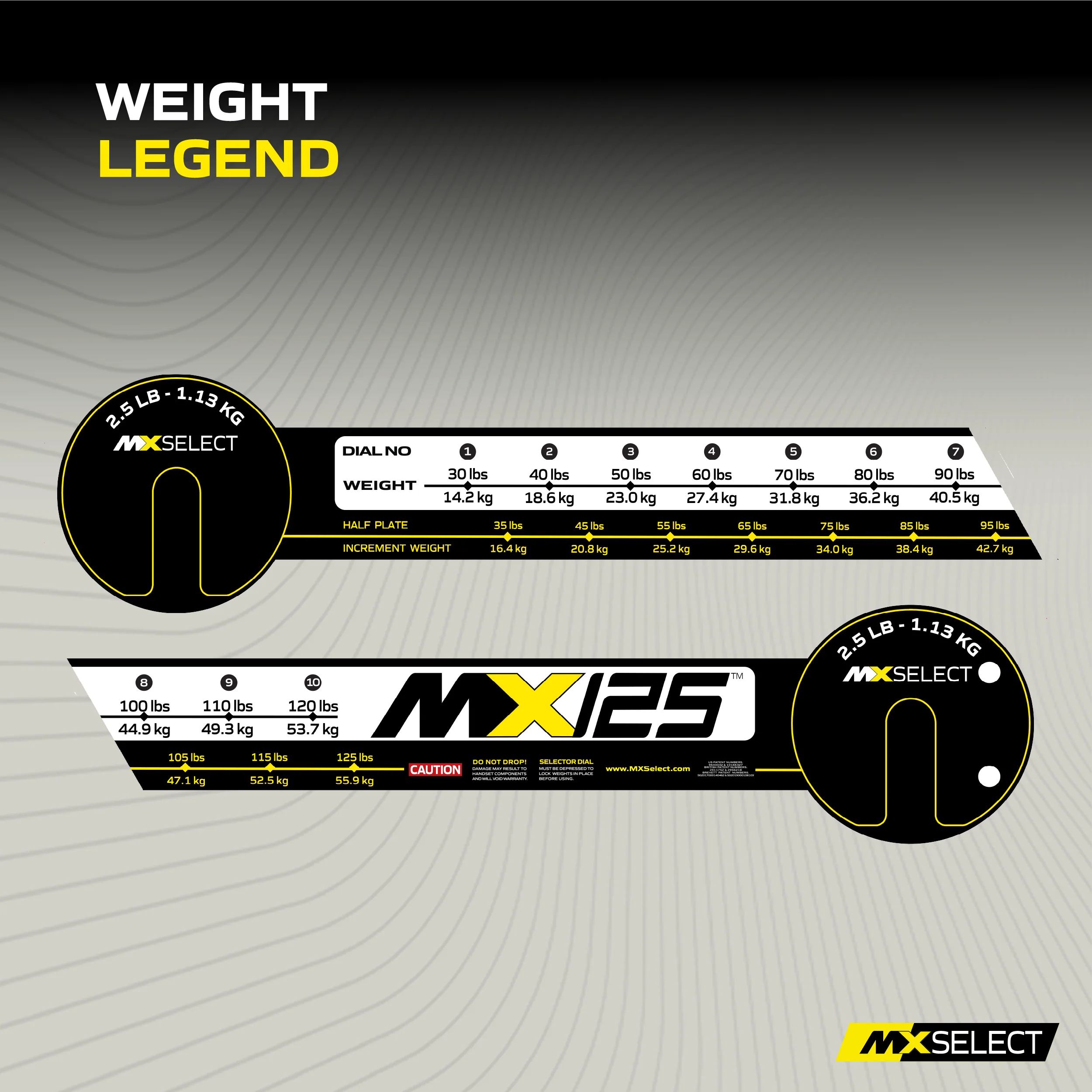 The MX125 Rapid Change Barbell System is a space-saving, all-in-one weightlifting solution featuring MX SELECT’s patented rack-and-pinion design with a secure Positive Lock System for confident training. This innovative system includes a knurled steel Straight Bar and EZ Curl Bar, along with 120 lbs (53.7 kg) of weight plates and magnetic increment plates for precise adjustments. With 20 weight settings per bar, you get a total of 40 weight options, ranging from 30–125 lbs (13.1–56.5 kg). The included storage rack enables quick switching between bars, while the simple dial selection system ensures seamless weight changes—perfect for efficient, high-performance workouts