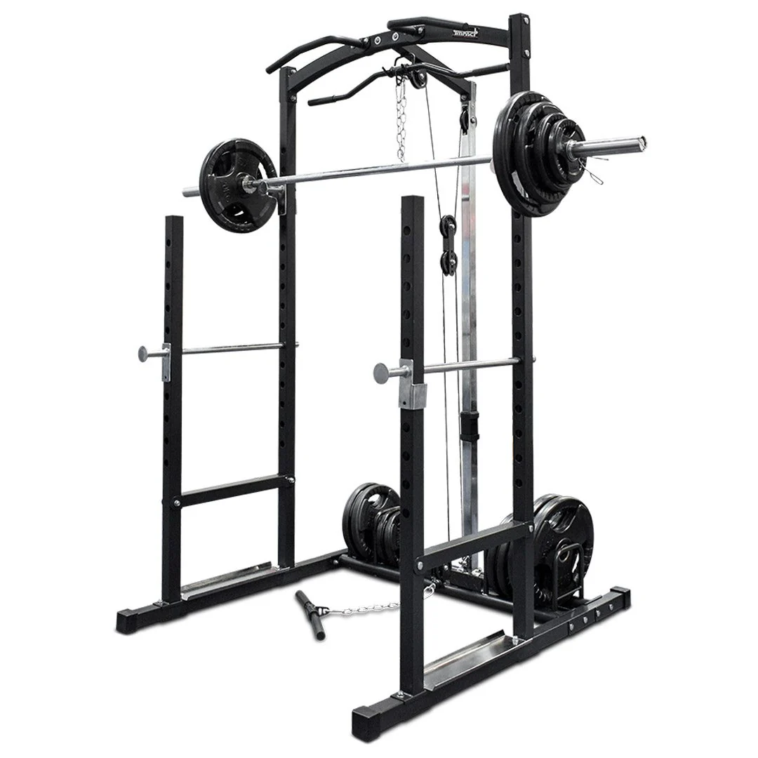 Impact Fitness has created the IMPC985 to feature a squat rack with safety spotter arms, pull up bar and lat pulldown with row pulley to combine 4 machines into 1.
