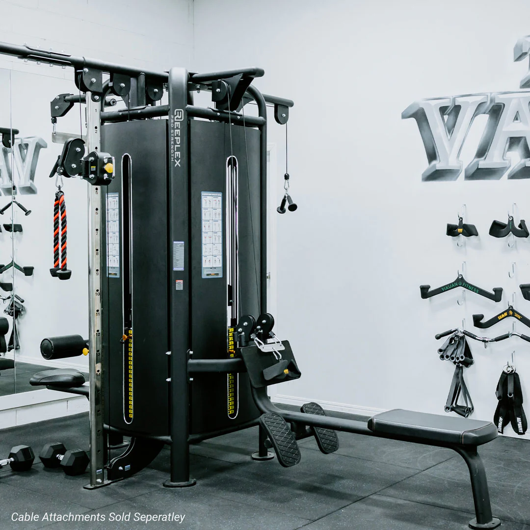 Reeplex 8 station commercial jungle gym includes a 1 x cable crossover, 2 x seated row, 2 x Lat Pulldown 2 x Tricep Pulldown and a pull-up multi-grip station all in one clever design. This multi-station monster is a must-have in any commercial gym as it combines all the popular cable machines into one allowing for up to 8 members to use 1 machine at the same time.