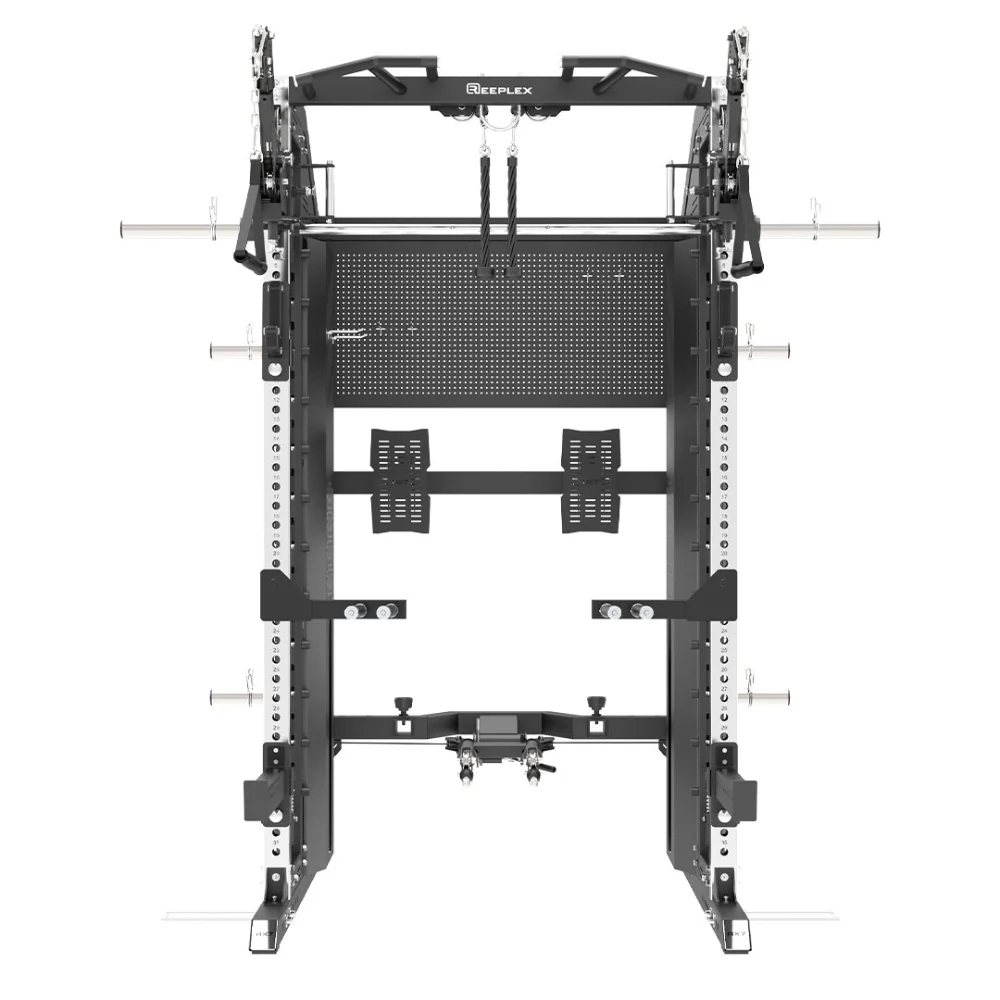 The Reeplex RX7 Multi-Functional Trainer features dual independent cable arms with 360-degree rotation and 21 adjustable height positions. With 90kg weight stacks on each side, it supports cable crossovers, chest presses, and isolation exercises for comprehensive upper body training.